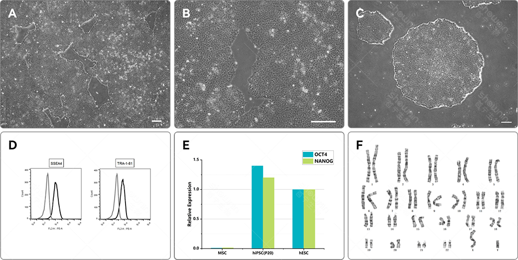 F:连续培养的hiPSC(P30)细胞核型检测(46,XY)。